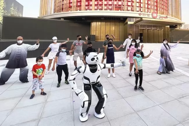 熊猫机器人优悠的出招有板有眼,将刚柔并济的太极拳展现出了新风采。不仅如此,TA还在现场当起了“小老师”,教世界各地的游客们打太极,传扬中国传统武术文化。