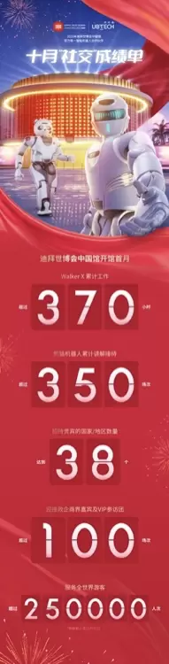 迪拜世博会开幕首月,中国馆累计参观游客超过25万人次。作为中国馆的和平友好使者,熊猫机器人优悠累计讲解接待超过350场次,其中有超过100场是接待来自阿联酋、奥地利、俄罗斯、德国、法国、日本等38个国家和地区的825名贵宾,包括46名副部级以上官员和27个参展国的政府总代表。位于北斗馆的Walker X机器人则累计工作了超过370小时。这是人类历史上首个实现商业化落地应用的大型仿人服务机器人,也是首次有大型仿人服务机器人在全球顶级盛会中稳定地提供长时间的智慧导览服务,向全球观众展示了中国智造与科技创新的成果,向世界传递中国AI。