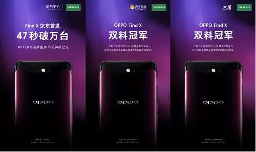 Find X的市场表现也完全没有辜负市场对它的期待,电商渠道一上线就是全线飘红:京东渠道47秒销售破万台,15分钟破亿;销售2小时更是拿下天猫,苏宁平台的全价位段手机单品销量&销售额的“双料冠军”。
