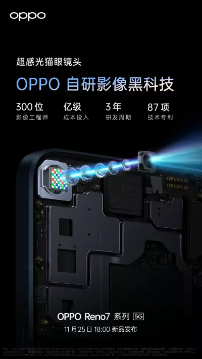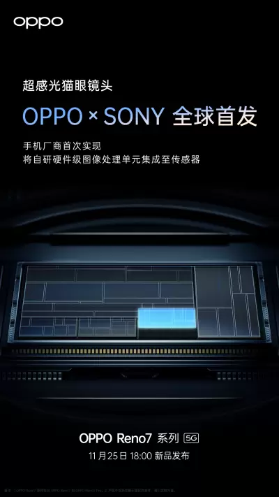 11月23日,OPPO宣布Reno7将全球首发索尼联合定制镜头IMX709(超感光猫眼镜头),搭载OPPO自研RGBW图像处理单元,大幅提升暗光拍摄表现力。