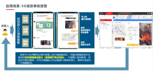 在5G消息报警方式下,报警人可通过消息对话方式快速把现场定位、手机里拍摄的相关图片和音视频等细节信息上传至“中心”,以精准丰富的数字化信息取代了语言描述,接警后后台还能迅速形成事故上报人、指挥中心和事故处理人三方联动,大幅缩短响应时长,从而帮助消防部门快速扑杀火情,将人民群众的生命财产损失降至最低。