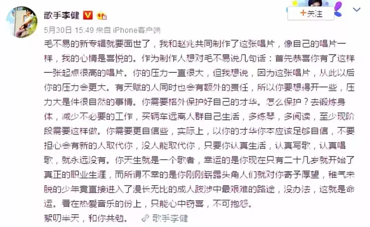 李健老师不仅像制作自己唱片一样帮助毛毛完成新专辑,惜字如金的李健老师还发长文鼓励,并给出了保护才华的方法:去锻炼身体,减少不必要的工作,买辆车远离人群自己生活,多练琴,多阅读。