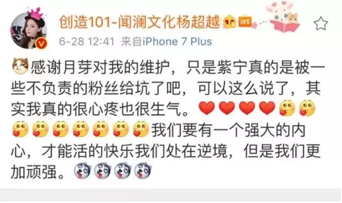 看两家粉丝平息了战火,杨超越才删了评论,单独跑到超话里去安慰粉丝,说紫宁只是被某些粉丝坑了。