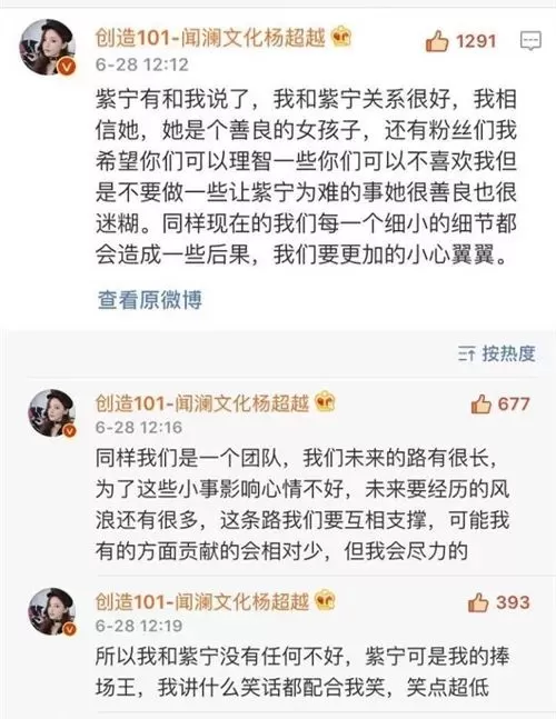 结果引来了杨超越本人,说紫宁和她道歉了,两人关系很好,是她的捧场王,劝大家不要撕...