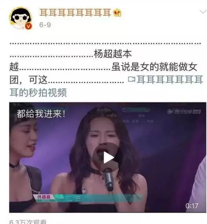 而且紫宁艾特的这位粉头@耳耳耳耳耳耳耳耳,虽然是紫宁家大大,但估计她自己也没仔细看,这个粉头的微博里,有不少DISS杨超越的东西↓