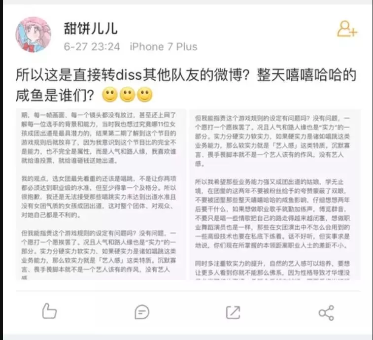 但文中有大量diss其他队友的内容,比如“唱跳实力未达水准”、“没有女团气质”、“沉默寡言、畏手畏脚”、“整天嘻嘻哈哈的咸鱼”