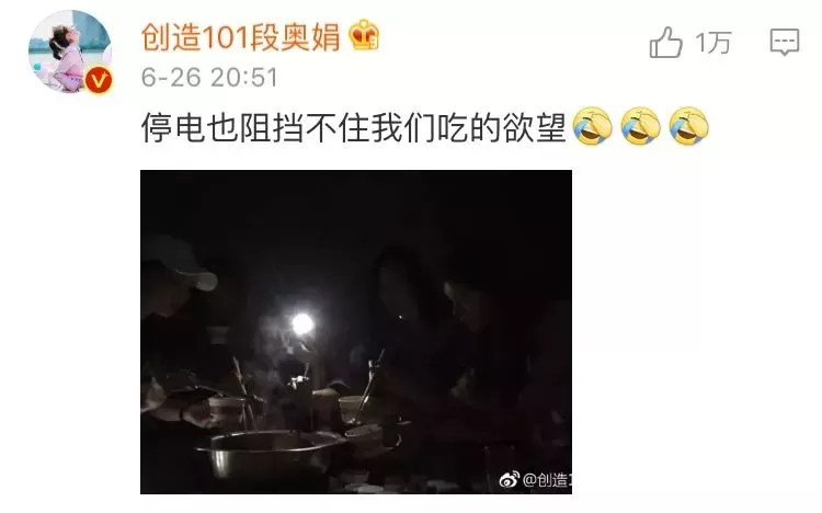 谁知道吃着吃着还停电了,傅菁还专门发了微博说,停电也不能阻止我们涮火锅!