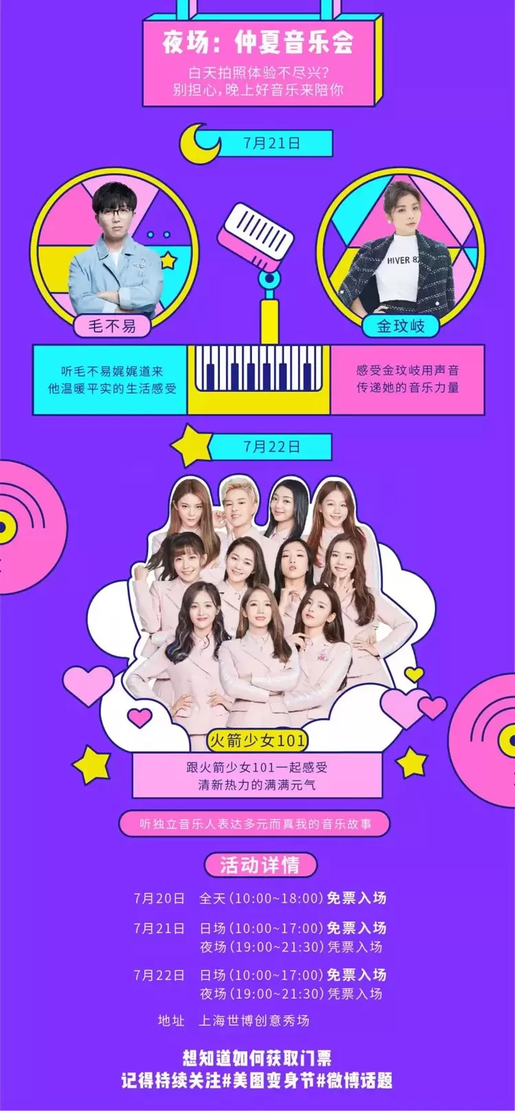 除了她们,毛不易和金玟岐也会出席美图变身节进行表演,他们的演出时间是在7月21日晚上。