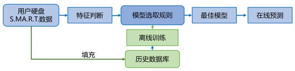 SSD寿命预测流程如上图所示。整体的预测流程分为两个阶段,绿色为离线训练阶段,目的是为了确定模型选取规则;蓝色为在线预测阶段,用于在用户环境中预测SSD寿命。