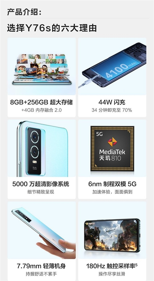 除了机身精致轻薄的星钻设计外,vivo Y76s在硬件设计上延续了vivo对于品质的高要求,搭载了联发科天玑810,基于台积电6nm制程打造,八核CPU 包含主频为2.4GHz的A76大核,可充分发挥性能和实现低功耗。在游戏方面,天玑810还支持HyperEngine 2.0游戏引擎,支持120Hz刷新率全高清FHD+显示。