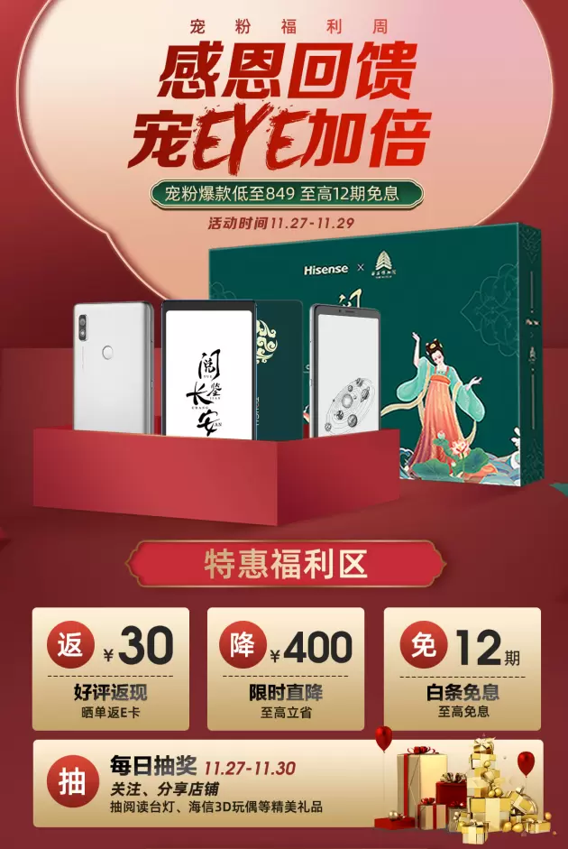 目前,海信阅读手机A7系列两款产品活动期间直降后可享再减,其中经典版售价仅1899元,彩墨版到手价仅2349元,两款产品还有3期京东白条免息和晒单返E卡附加优惠,宠粉福利时间有限,快来店内选购吧。