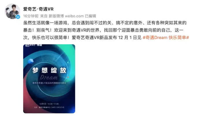 梦幻新品来了!爱奇艺奇遇Dream新品发布定档12月1日