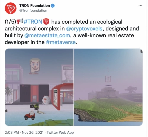 11月26日,波场TRON发布推特表示,其生态建筑群已于Cryptovoxels中完成竣工。该生态建筑群由知名元宇宙房地产开发商MetaEstate设计搭建而成,是继Superare及SpaceX之后在Cryptovoxels设立的又一生态展示区。后续波场TRON也将快速完成元宇宙赛道的布局。