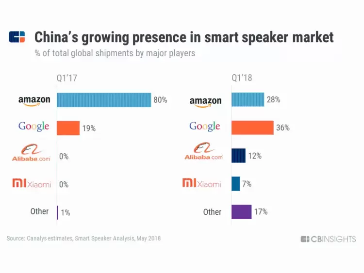 调查数据显示,2017年第一季度,亚马逊智能音箱的全球市场占有率高达80%,紧随其后的谷歌有19%,阿里巴巴和小米的市场占有率均为0%。而到了2018年第一季度,数据发生了明显变化:亚马逊的智能音箱在全球的市场占有率下降至28%,“后来者居上”的谷歌占到36%,其次是阿里巴巴12%的市场占有率、小米7%的市场占有率。