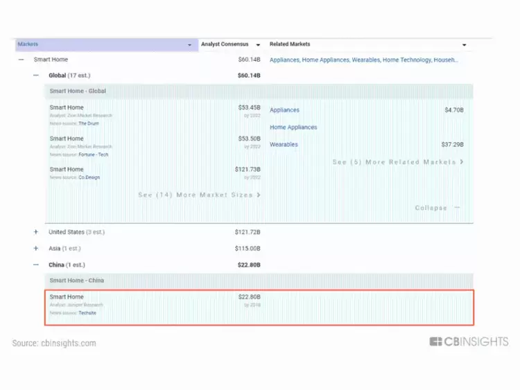以下是CB Insights的分析师对智能家居市场的预计情况的汇总。