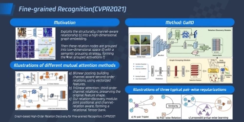 4)细粒度识别:过往的细粒度识别主要是使用通道间高阶特征获取可区别性的表达,但这种做法一般都会忽略空间位置关系的和不同语义之间的相互关系,在复杂背景或内间距比较小的场景中误判的情况较多。基于此类问题,腾讯优图曾提出了通过挖掘特征间的空间关系和语义关系来建模高阶关系,再对其中一些相似关系进行合并、保留区别性高的特征的解决方案。