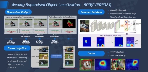 2)目标定位:人、车、物的检测工作所要求的标准检测的框和目标标注的成本都很高,而在细分场景检测时需要标注的比较精细,从而提升了标注的难度和成本。为了提高标注的效率并降低成本,腾讯优图在弱监督和定位方面进行深入研究,并提出了目标结构保持是弱监督定位关键问题的观点。