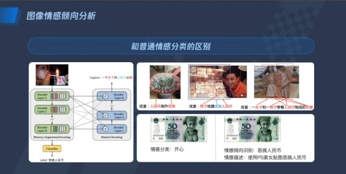 2)图像情感倾向分析:现阶段的内容审核工作中,审核系统对于出现人民币、暴力等敏感元素的图片都会做召回处理。但实际场景中,大量出现人民币元素的图片是正常的,这无形中为人审环节增加了很多工作负担。