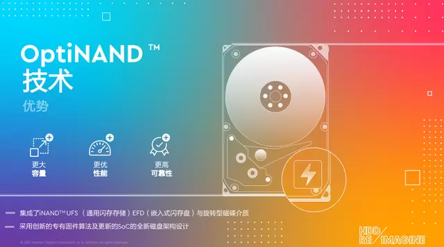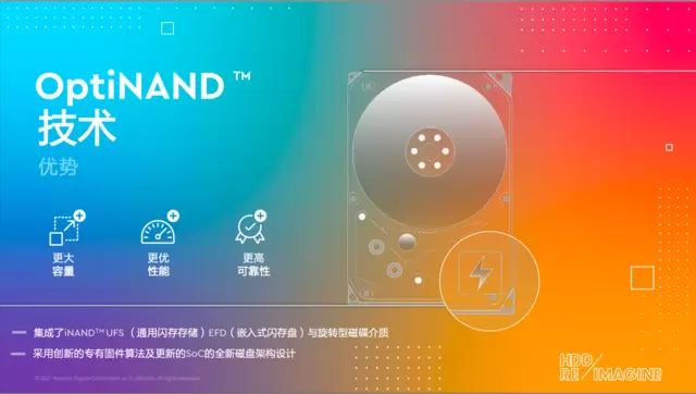 而在HDD技术方面,西部数据也有Helio Seal技术、能量辅助记录技术和三阶导轨定位系统等业界领先技术作为支撑,最终,通过将优化的SSD整合到HDD当中,便产生了OptiNAND这一创新磁盘架构技术。