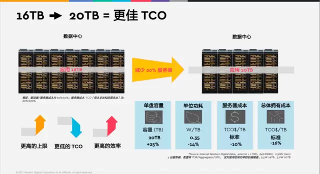 正因此,西部数据此次发布的20TB Ultrastar DC HC560 CMR HDD对数据中心行业意义重大,首先是整体容量提升带来的直观优势:在数据中心配置不变的前提下,将HDD密度从16TB提升至20TB,可以降低每TB14%的功耗和部署成本,最终反馈在长期运营成本上,则会带来10%的服务器成本降低和16%的总体拥有成本降低。