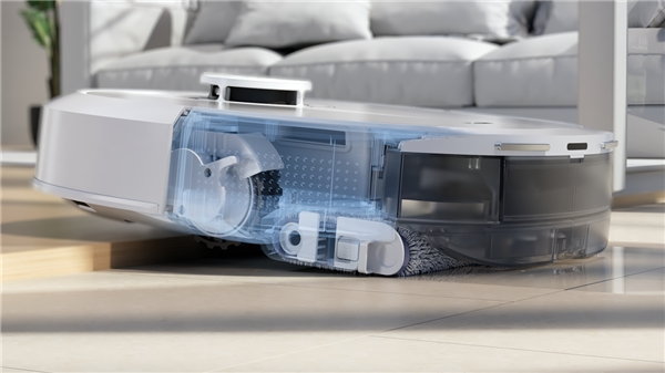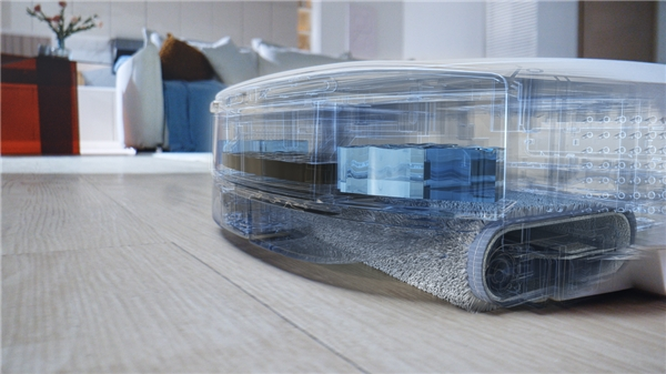 令人惊喜的是,晓舞的机身运动系统由左右驱动轮、万向轮、履带式拖布组成。在清洁过程中,主机左右驱动轮及万向轮驱动机器人前进、后退、转向,保持平衡。而本次履带式拖布的设计不仅有效提升了清洁效果,更可以化身驱动,辅助机器人爬升越障,让机身全屋穿梭自由,同时满足客厅、卧室、厨房、浴室、阳台等场景清洁需求。
