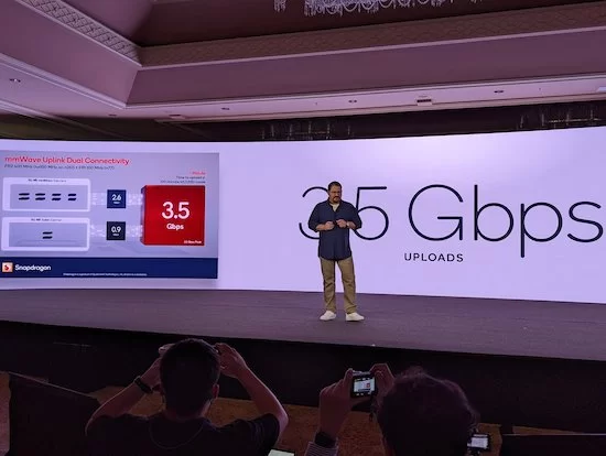 在连接能力上,年初亮相的骁龙X65调制解调器让该平台还拥有最高10Gbps的峰值下行,以及3.5Gbps的峰值上行,夏威夷现场高通安蒙还利用这一特性,仅通过搭载X65的手机就与Verizon公司Kyle Malady实现了全球首个8K HDR视频电话。并且X65也让新一代骁龙8移动平台还支持R16规范。