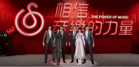 除了三个“丁磊”同时敲锣外,整个会场的布置也随处体现音乐热爱者的元素,不仅座位是爱心的形状,还有后排是“相信音乐的力量”的闪烁灯牌,舞台上是转动的黑胶唱片。更有意思的是,参与观礼的嘉宾可以操控自己的“数字分身”,与AI虚拟人“丁磊”一起完成交流、合影、跳舞等等互动。