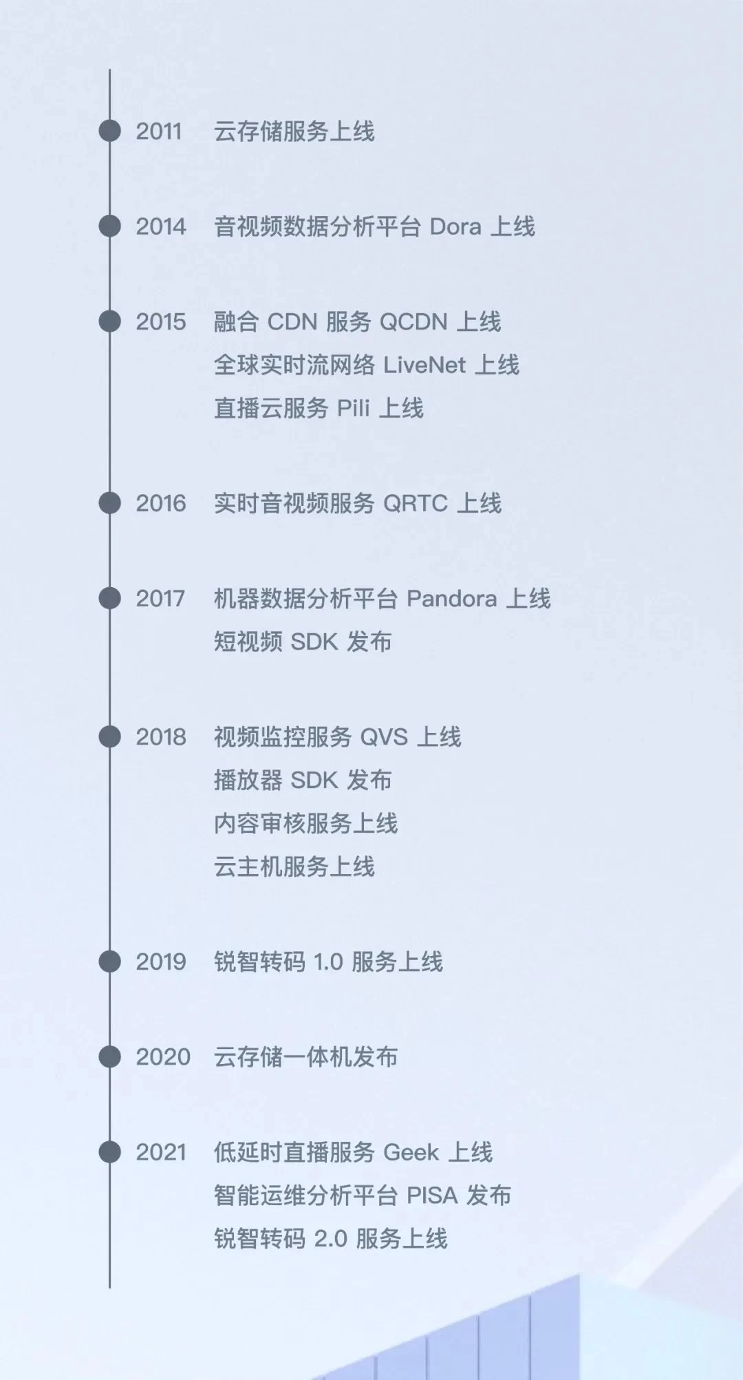自成立起,七牛云始终着眼数据,不断优化战略布局,在过去的十年发展中坚持技术创新。从 1.0 的企业级云存储平台,到 2.0 的一站式数据管理平台,再到 3.0 的“云+数据”一体化 PaaS 平台,在统一的异构数据湖和云原生底座上,七牛云通过对音视频与数据科学领域的长期布局和持续投入,实现百万级客户的服务部署。