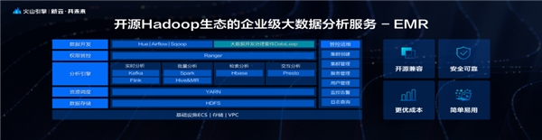 企业使用开源Hadoop平台面临的构建运维高门槛、高成本的痛点问题,得到了E-MapReduce的针对性解决。E-MapReduce作为开源Hadoop企业级大数据平台服务,支持一键创建大数据集群,提供Hadoop、Spark、Hive、Flink等生态组件集成和增强,具有开源兼容、安全可靠、更优成本、易管理运维等优点。另外,E-MapReduce还可与大数据开发治理套件(DataLeap)结合,支持端到端数据接入、存储、计算能力,帮助用户轻松完成企业大数据平台的构建和数据上云。