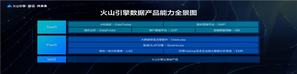 随着上述四大产品的集中发布,火山引擎希望为企业打造敏捷数智引擎的构想进一步落地,一张数据产品能力全景图逐渐清晰可见——它覆盖了在底层统一基础设施IaaS之上的从PaaS层到SaaS层,一系列场景中的全链路数据服务,满足企业从数据平台建设到数据产品应用等多样化数字化转型诉求。