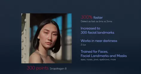 在此之上辅以人脸识别算法,骁龙8将面部特征识别点增加到300个,能够捕捉到更为细微的表情变化,同时人脸检测速度也提升了300%。