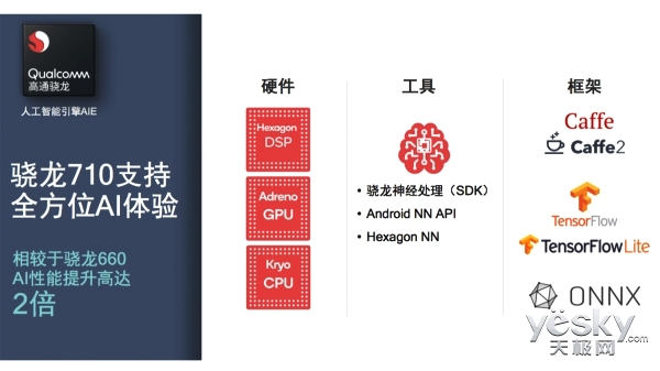 当然Qualcomm AIE在不同骁龙移动平台上可以发挥的性能及功能都有一些差异化,比如骁龙710相比骁龙660,在人工智能 就实现了2倍的性能提升。