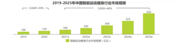 自去年开始,整个智能健身赛道的发展不断加快,并且华为、小米等科技巨头也开始布局投身这一市场。据《2021中国运动健身行业报告》显示,今年我国家庭智能健身设备消费支出同比增速达到32.9%,创下近三年来新高。而另据《中国智能运动健身行业研究报告》预计,到2025年,智能运动健身行业市场规模预计达到约820亿元,年均复合增长率高达46%。