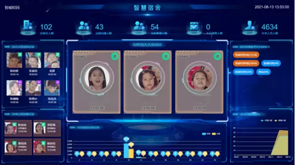 这套系统还可应用在宿舍管理场景,对住宿学生进出自动抓拍比对,后台联网生成记录;如遇外人进入或其他学生违规串寝,系统将自动识别,启动大屏实时告警。支持手机在线查寝,晚归未归、超时未出等异常行为。