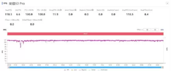 经多位知名数码博主测试,在《王者荣耀》的》120Hz高帧率模式下,荣耀60 Pro的平均帧率118.58帧,整体非常平稳,可与目前市面上众多的旗舰级产品相媲美。
