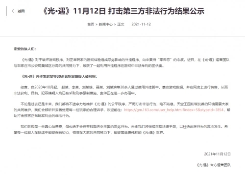近期,为落实未成年人游戏新规,网易游戏基于自身技术积累,针对疑似未成年用户,积极探索人脸识别验证功能。同时,网易游戏积极响应国家政策,针对未成年人租售游戏账号等黑产问题展开专项治理,协助执法部门严厉打击违规售卖实名账号的工作室。目前,已在多个平台成功维权下架违规商品。