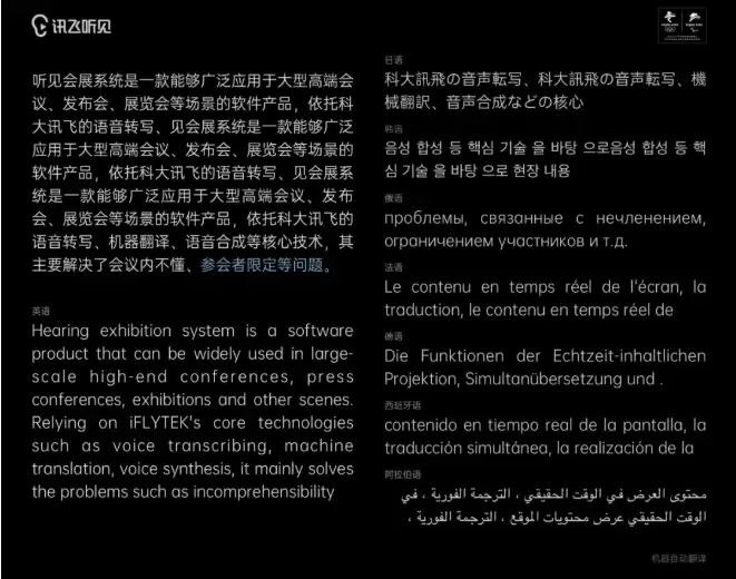 讯飞听见同传能够广泛应用于会议办公、展厅、跨国交流、线上线下会议、发布会等多类会议场合,拥有离线单机版、在线客户端两种产品形态,依托科大讯飞的语言转写、机器翻译、语音合成等核心技术,提供9国语种的语音识别和机器翻译,并辅以AI字幕投屏、多语种会议记录、机器学习和优化等功能,支持通过手机扫码收看会议记录、收听会议内容和多语种语音合成播报,可搭配专业人工同传译员进行使用。