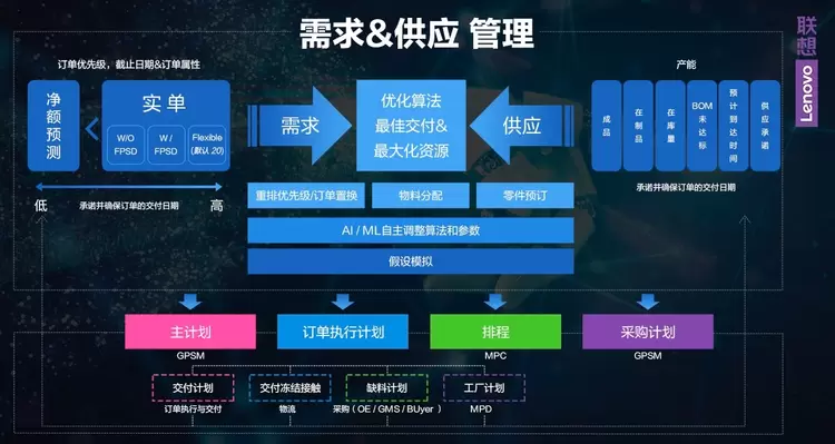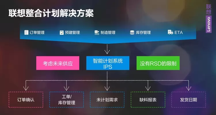 为此,联想通过统筹四大计划系统(需求履行、工厂制造、缺料管理、出货控制),制定订单交付优先级的全球统一政策,同步出货计划及产能等一系列措施,完美统一计划与执行,精准预测出货日期。