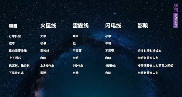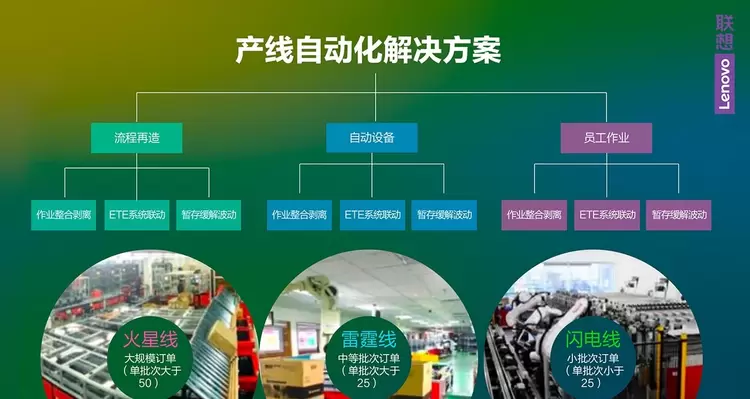 联想惠阳工厂自动化线体根据订单类型分为三种模式,大批量、高自动化的火星线模式,中批量、高自动化、高效率的雷霆线模式,小批量、高自动化、高柔性、高效率的闪电线模式。分别对应不同的订单体量,做到对不同订单形式针对性匹配,实现订单的高效生产,从而实现综合效益的优化。