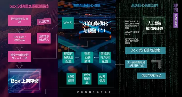 关于包装,联想基于深度学习中的增强学习技术,创造性应用传统的运筹优化算法,实现了从整箱配给、散件配载装箱到箱型组合码托、托盘配载装柜的多层智能模型和算法;同时,集成基于运单需求履约、在库货品状态和出库包装最优组合,实现从拣选到装运的端到端智能包装模型和算法。
