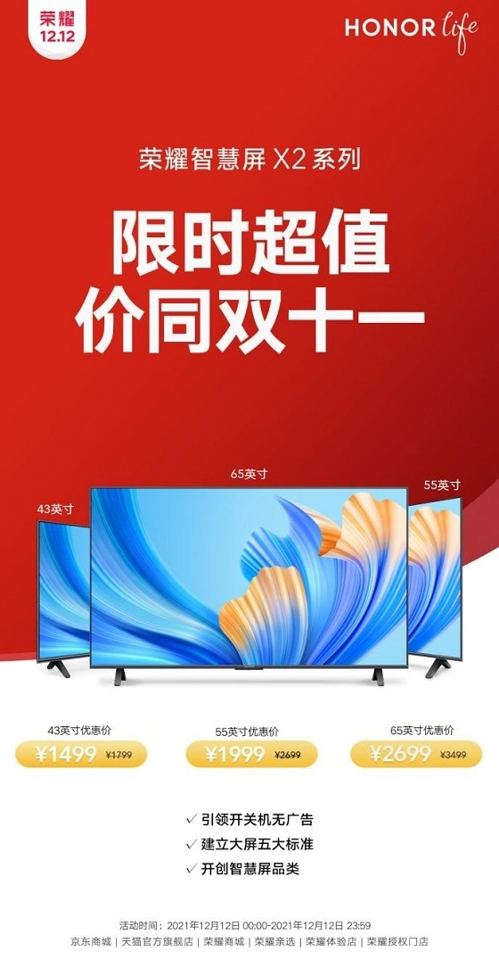 12月12日当天,荣耀智慧屏X2系列将在京东商城、天猫官方旗舰店、荣耀商城等平台开启超值活动,原价3499元的65英寸限时2699元,2699元的55英寸限时1999元,1799元的43英寸限时1499元,提前加入购物车,双12一键享优惠。