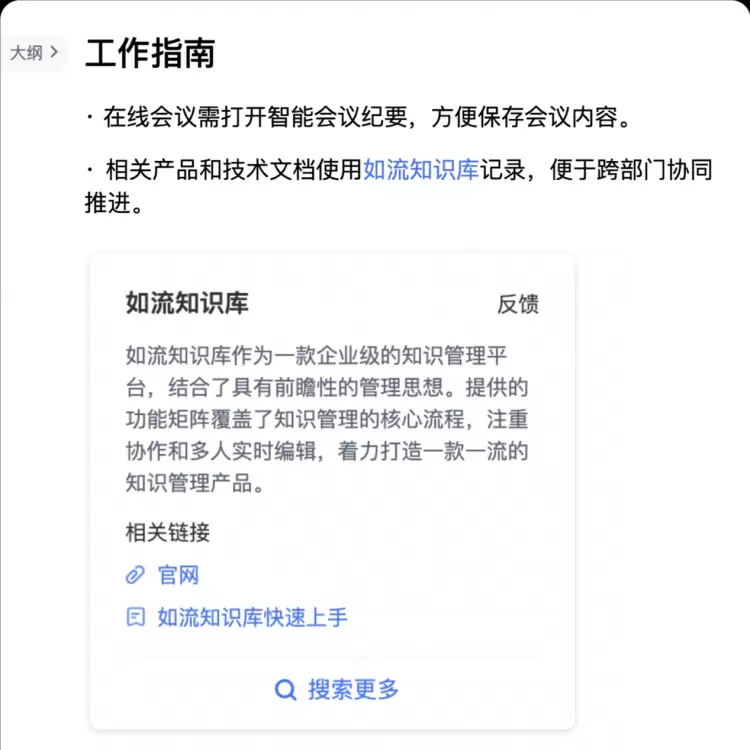 从如流“AI+知识管理”的路径上,我们可以看到,如流不仅仅帮助企业存储知识以备员工使用,更关键的是以工具为媒制度性地将知识盘活。以知识星链在如流智能知识库的实际应用为例,当我们在阅读内容时,知识星链会自动识别和解释关键词,或者按照需求,跳转到相关页面,大幅度提升阅读效率。