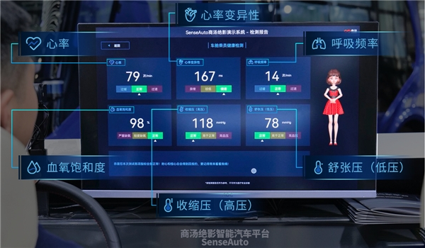 基于长期深厚的学术积累和原创技术研究,结合对智能车舱发展趋势和市场需求的前瞻洞察,商汤在本届创交会上全新发布SenseAuto Cabin-O商汤绝影车舱乘员健康检测产品,并在现场进行了展示。应用时,基于先进的计算机视觉算法,系统会通过AI技术感知用户面部测量区域,最快15秒就可以测出车舱乘员当前的心率、心率变异性、血氧饱和度、血压和呼吸频率,测量结果准确度接近医疗专用器械水平,无接触的测量方式也更加安全、快捷,帮助用户快速了解生命体征状况。