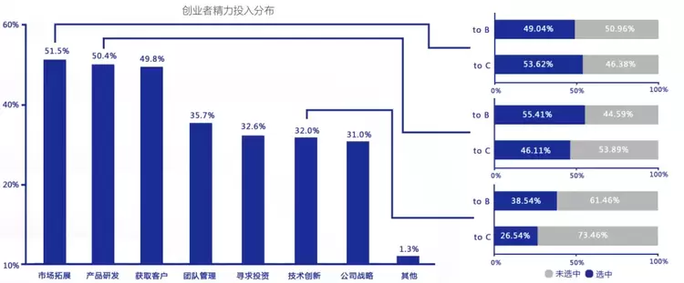 在融资方面,有52.55%的创业者启动资金在50万以下,个人家庭成最主要资金来源渠道,占比69.87%,高于第三方风险投资(15.43%)。除融资外45.12%创业者还希望得到相关政策支持。此外,花钱也是创业者的一项重要工作,整体而言,人员开支及研发支出为创业公司最主要的两大“烧钱”投入,支出占比超50%。但比起找投资,市场拓展、产品研发和获取客户是创业者最耗费精力的三个板块,其中ToB模式企业更重视技术类及产品研发类投入,而ToC模式企业则更注重市场拓展。