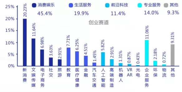 从创业赛道上看,随着数字化浪潮的迅猛发展,以新消费和文娱传媒为主的消费娱乐类赛道占比超过45%,仍为创业主流。报告认为,新经济发展动力之一是技术变革,颠覆性突破在等待期内仍有大量发展机会。以人工智能、机器人等为代表的前沿科技类创业项目占比约为11.4%,硬核创业方兴未艾,仍是新时代的重要发展方向。在商业模式上,54.3%创业者选择ToC业务,略高于ToB业务的45.7%。