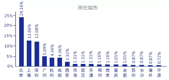 从区域来看,北京、上海、深圳仍为创业者的主要集聚地。参与本次调研的创业者中,有24.16%的创业者选择在北京创业,选择北京、上海、深圳作为创业所在城市的创业者占总样本的48.90%。北京、上海、深圳基础设施更完善,在创业政策、市场和创业文化上仍处于领先地位,其人才资源、信息资讯、交际圈子上的优势,让创业者更容易获取创业资源。