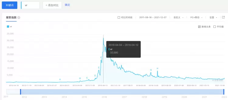 VR是一个典型的概念先行行业,2016年,VR概念就被大规模推广起来,从“VR”这一关键词的网络搜素热度可以清晰看到,当时的搜索热度超出今年平均值的10倍以上。尽管当时VR被广泛关注,但产品体验仅停留在概念层面。