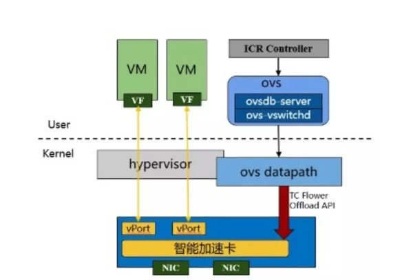 具体来说,传统OpenvSwitch在内核进行流量转发,这种方式的性能取决于CPU的算力,引入智能加速卡之后,在内核转发下面增加一个网卡硬件快转路径,配合智能加速内核提供以下加速能力: