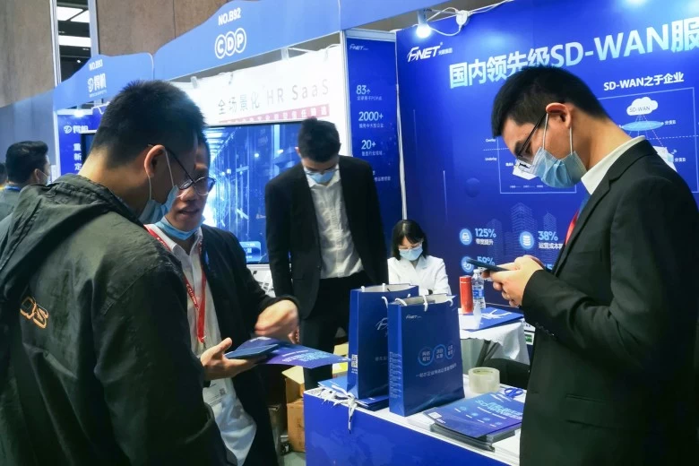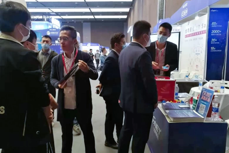 盛会展位区,光联展台吸引了不少参会嘉宾驻足交流,光联SD-WAN项目人员与来访人员就当前形势下企业在数字化转型中的发展经验展开了交流与探讨,并向各企业CIO详细讲解了光联SD-WAN在智能制造、新零售、数字金融等领域的成功应用案例。