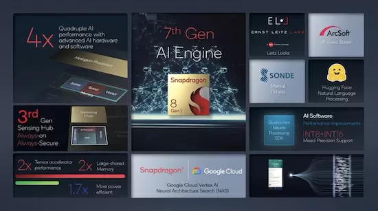 高通全新一代骁龙8移动平台同样大幅提升了AI性能,集成的第七代 AI Engine 人工智能引擎中,Hexagon 处理器实现了性能翻倍的表现,同时对共享内存进行了翻倍。在广泛的 AI 模型用例中的推理时间比前代 AI 引擎快 4 倍,同时 AI 能效比前代提升 1.7 倍。这使得骁龙 8 的 AI 性能在 inceptionv3、mobilenet_v2、Resnet50、VDSR 等 AI 测试中能实现最高 4 倍的提升。同时AI软件性能也提升2倍。